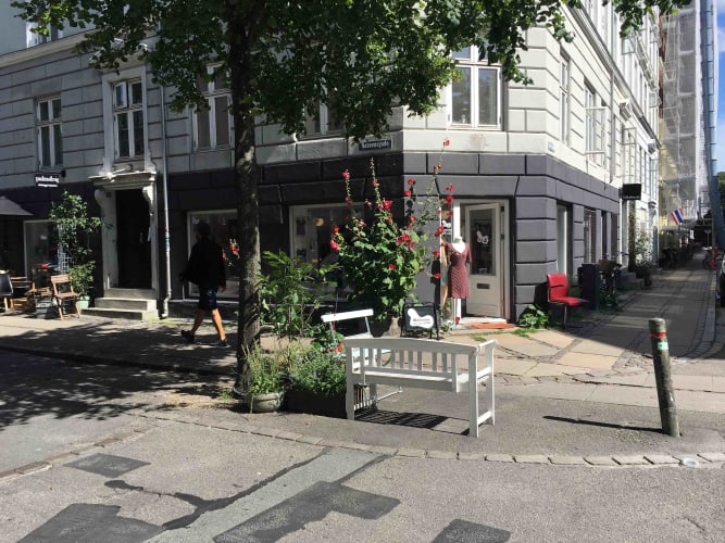 Stor lys hjørnebutik, med tre gode udstillingsvinduer