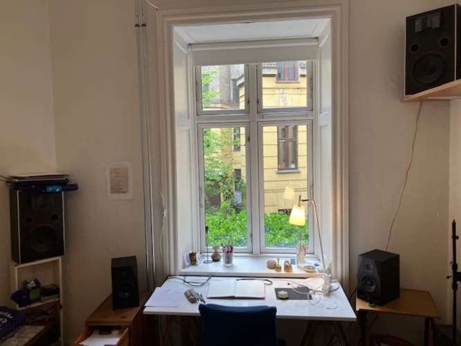 Der er fælles toilet og køkken og en dejlig tagterasse. Rummet er godt egnet til skrivning, grafisk arbejde, research, kunst, lydproduktion, komponist-arbejde mv. Man kan spille og producere lyd fra kl. 8.00 - 20.00 - og arbejde uden lyd døgnet rundt. Rummet deles med komponist Anja Jacobsen - man booker sig ind via en google kalender.