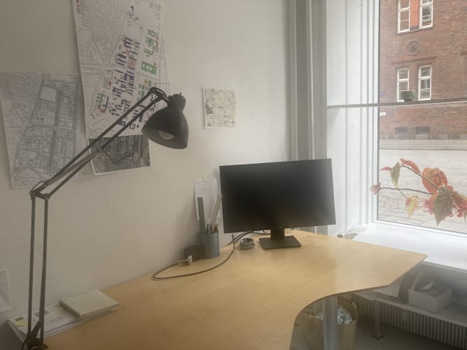 Kontorplads i centralt beliggende erhvervslejemål tæt på søerne, på Østerbro, udlejes i tre måneder. Jeg udlejer en lys kontorplads med hæve/sænkebord i vores lille tegnestue de næste tre måneder. Der er wi-fi og i øvrigt fred og ro.