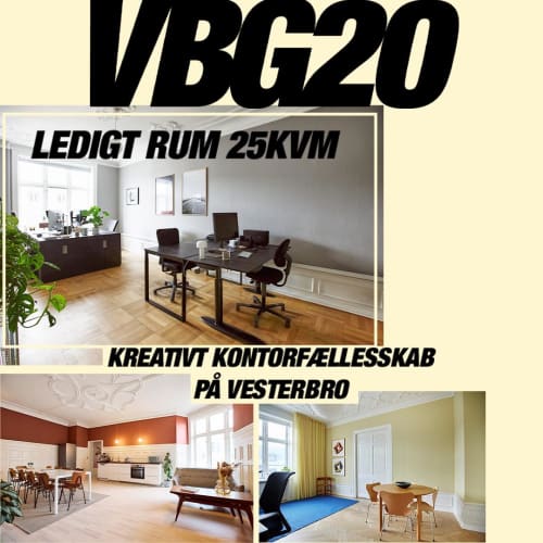 Vi har et helt rum ledigt hos os på VBG20. Det er ca 25m2, og er ledigt nu. Så er det interessant for dig at have dit eget, I et fællesskab, hvor der er julefrokost og 'kollegaer', så er det her en oplagt mulighed. Lille firma eller andet er oplagt.