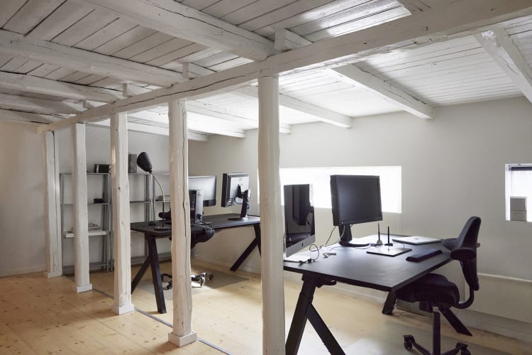 Vi arbejder alle via computeren, så der er mest aktivitet ved pladserne og ellers mulighed for samtale over kaffe i køkkenet og en fantastisk baggård.