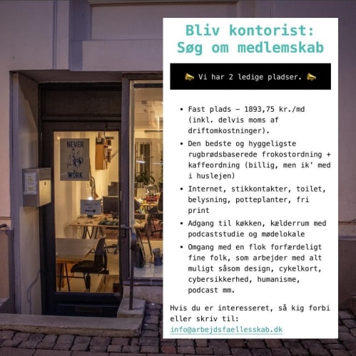 Vi har ledige pladser i Arbejdsfællesskabet Tranen! For 1.893 kr. om måneden kan du få kontorplads centralt på Nørrebro med Københavns bedste kolleger.