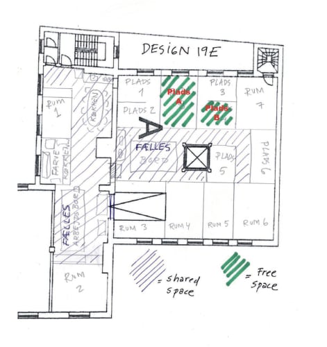 Alle medlemmer har deres egen arbejdsplads/kontor. Disse varierer i størrelse, men fælles er at vi alle har personlige rum og arbejdspladser udover vores fælles arealer og maskiner.