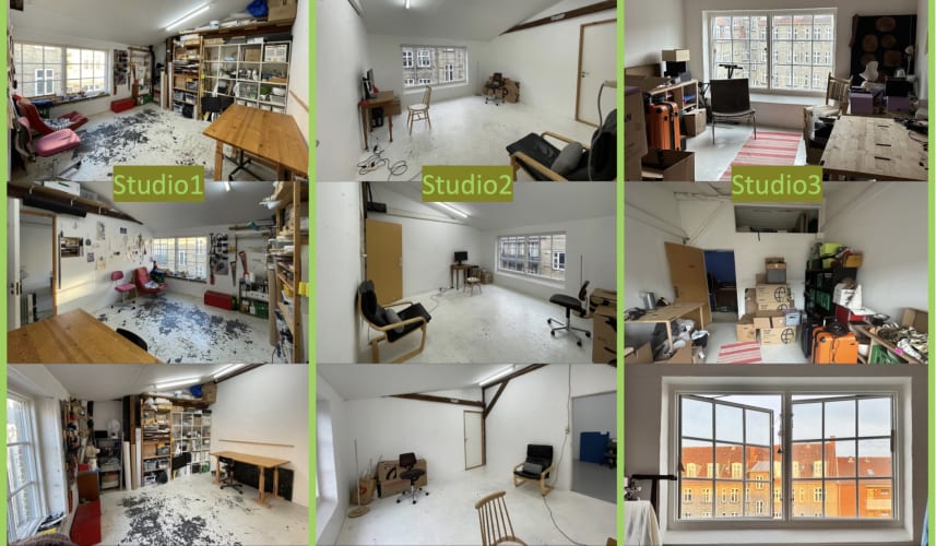 Three separate spaces available in a cozy studio community in the area of Amagerbro. We are 7 artists with diverse practices – three of whom will now be moving.