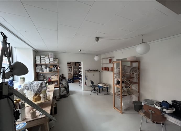 Jeg søger en lejer til et keramikværksted på Lybækgade 8, København S. Værkstedet er 94kvm og deles med mig og to andre keramikere. Du får din egen plads og opbevaring. Der er en to drejebænke du kan bruge. Der er en ovne, hvor du kan brænde dine ting mod betaling.
