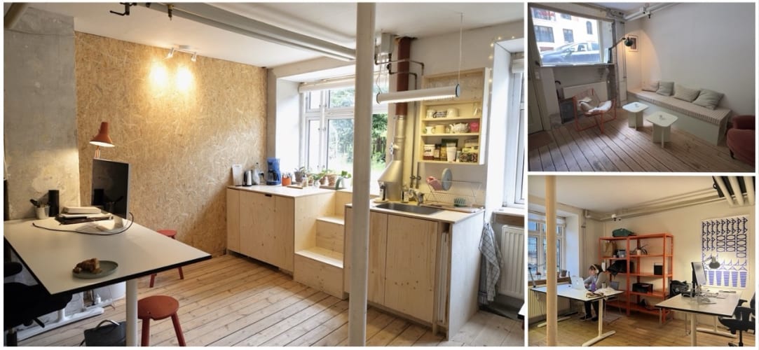 Atelier 18 ligger på Esbern Snaresgade, tæt ved KIHOSKH. Lokalerne er super hyggelige med god atmosfære. De ligger i en høj lys kælder med adgang til et lille solrigt udeareal og består af to rum: Et større rum med masser af sollys, lille køkken og 3 skriveborde, samt et mindre rum mod gaden med en hyggekrog og et fælles bord/værksted til små projekter. Indretningen er enkel og funktionel.