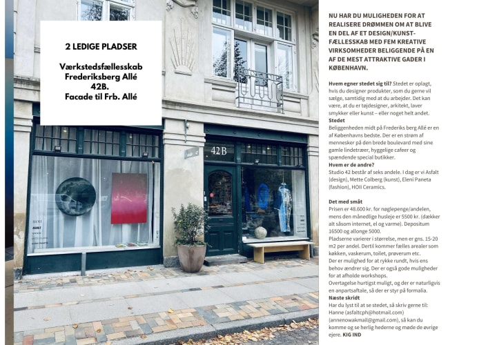 NU HAR DU MULIGHEDEN FOR AT REALISERE DRØMMEN OM AT BLIVE EN DEL AF ET DESIGN/KUNST-FÆLLESSKAB MED FEM KREATIVE VIRKSOMHEDER BELIGGENDE PÅ EN AF DE MEST ATTRAKTIVE GADER I KØBENHAVN.